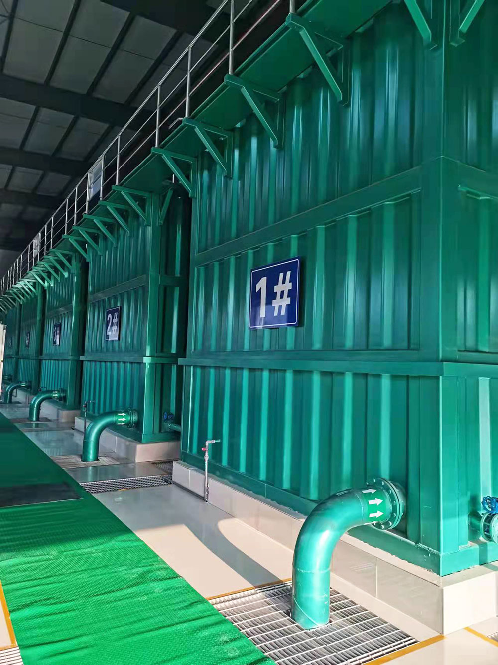 该水厂原水引自黄河,采用了前级预处理+模块化的絮凝沉淀过滤常规处理工艺。前级预处理采用粉末活性炭投加和高锰酸钾投加两种方式;常规处理采用网格絮凝、沉淀区斜管沉淀和过滤区均质石英砂过滤,以及次氯酸钠发生器产生次氯酸钠溶液投加清水池的消毒工艺。